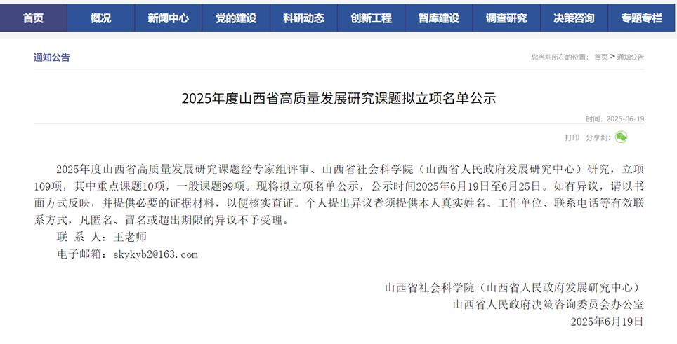 6月19日,山西省社会科学院(山西省人民政府发展研究中心)、山西省人民政府决策咨询委员会办公室发布了“2025年度山西省高质量发展研究课题拟立项名单公示”,我院获批3项,占全校立项总数的33.3%。
