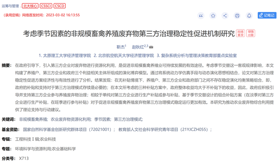 近日,我院教师靳杰的研究成果《考虑季节因素的非规模畜禽养殖废弃物第三方治理稳定性促进机制研究》在《运筹与管理》发表(网络首发)。《运筹与管理》是中国运筹学会主办的学术月刊,系国家自然科学基金委员会管理科学部认定的A类期刊。该论文是靳杰博士(第一作者)的合作成果。9499www威尼斯为第一署名单位。