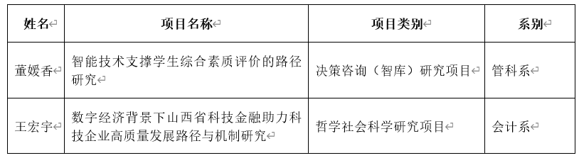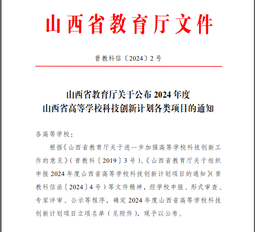 近日,山西省教育厅发布了 “关于公布了2024 年度山西省高等学校科技创新计划各类项目的通知”,我院董媛香教授和王宏宇老师的项目成功获批(见表1)。