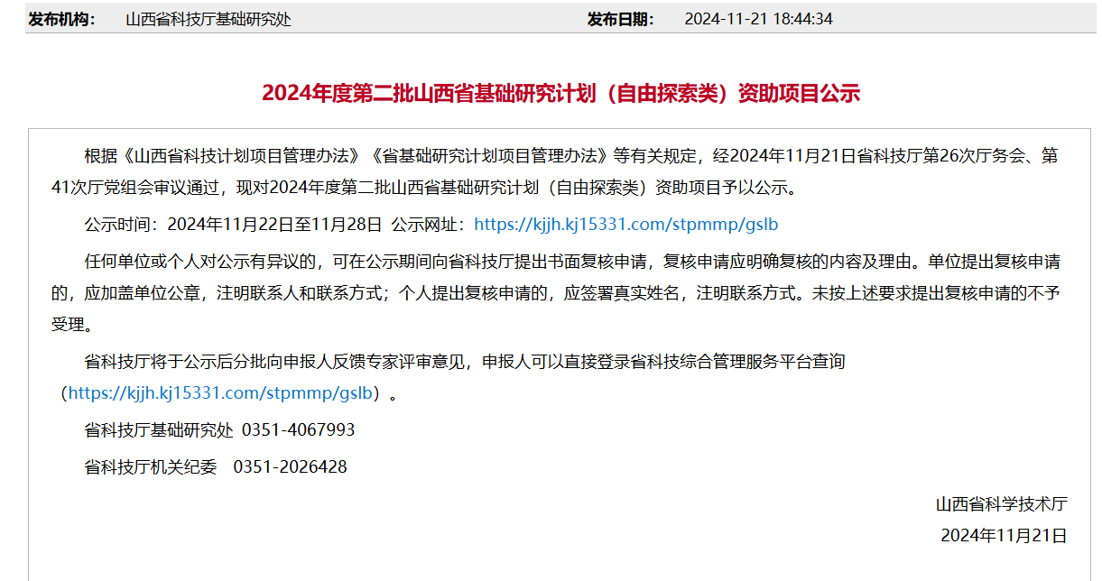 11月21日,山西省科学技术厅发布了“2024年度第二批山西省基础研究计划(自由探索类)资助项目公示”。我院姚西龙教授、靳立伟博士、禹敏博士、陈少华博士和郭松波博士等5位老师的申报项目获立项资助(见表1)。