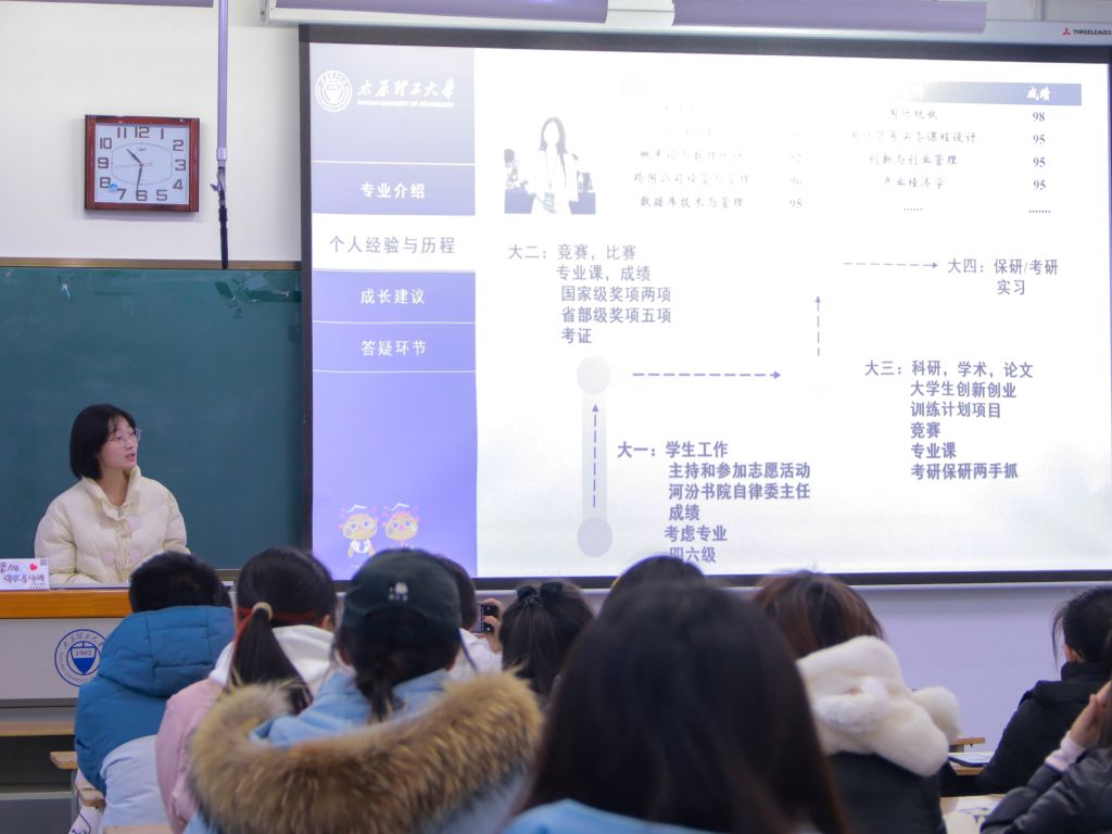 随后的学长学姐“说”专业环节同样精彩纷呈。张乐娟、张琳、王巨贤、田欣和贾林娜几位同学作为各专业的优秀学长学姐代表,以亲身经历为蓝本,用亲切而质朴的语言分享了自己在专业学习过程中的心得感悟、成长故事以及实用的学习技巧和方法。他们讲述了如何在专业课程学习中攻坚克难,如何通过参加各类实践活动和学科竞赛提升自己的综合素质和能力,以及如何在面临学业压力和职业选择困惑时坚定信念、找准方向。学长学姐们的真诚分享,为学弟学妹们提供了宝贵的借鉴经验,让他们在初入大学的迷茫中找到了前行的指引和动力。