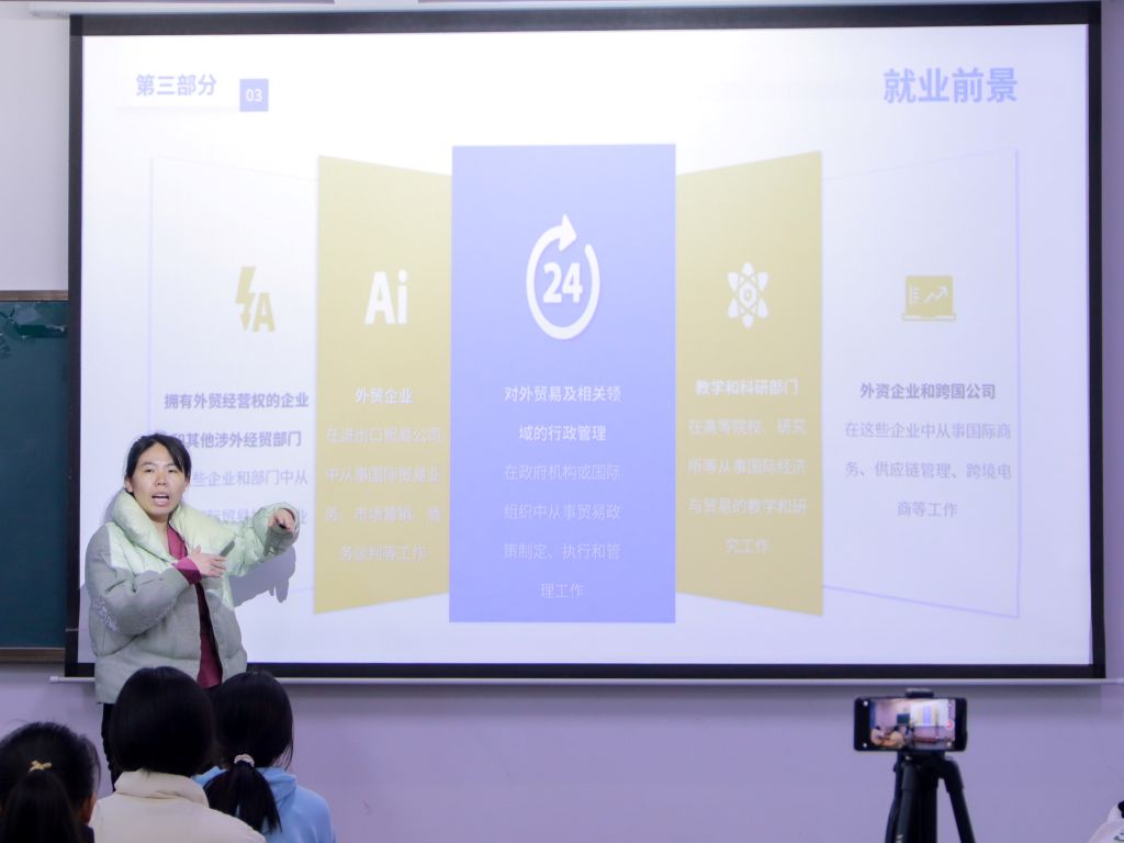 在青年教师“讲”专业环节,王蕾、申少飞、王建新、张荣霞四位老师分别作为国际经济与贸易、会计学、物流管理、工程管理专业的代表,凭借其深厚的专业知识储备和丰富的教学经验,为同学们深入浅出地解读了各专业的学科内涵、课程设置、培养目标以及未来的就业前景。老师们从宏观的专业体系架构到微观的专业核心要点,都进行了细致入微的讲解,不仅让同学们对所学专业有了更为清晰、全面的认识,也激发了他们深入探究专业知识的热情和兴趣。