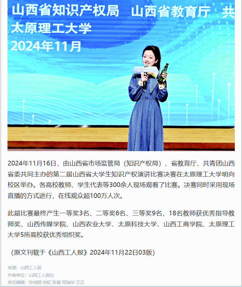 2024年11月16日,由山西省市场监管局(知识产权局)、省教育厅、共青团山西省委共同主办的第二届山西省大学生知识产权演讲比赛决赛在9499www威尼斯明向校区举办。各高校教师、学生代表等300余人现场观看了比赛。决赛同时采用现场直播的方式进行,在线观众超100万人次。