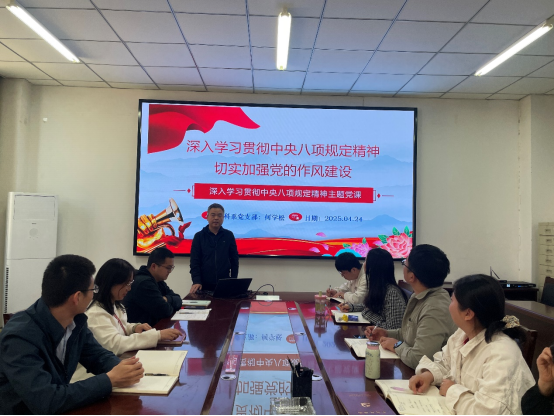 为深入贯彻中央八项规定精神学习教育,切实加强党的作风建设,4月24日下午,管科系党支部在226会议室开展深入贯彻中央八项规定精神学习教育主题党课,学院副院长王天日教授莅会指导,会议由支部副书记何学松主持。